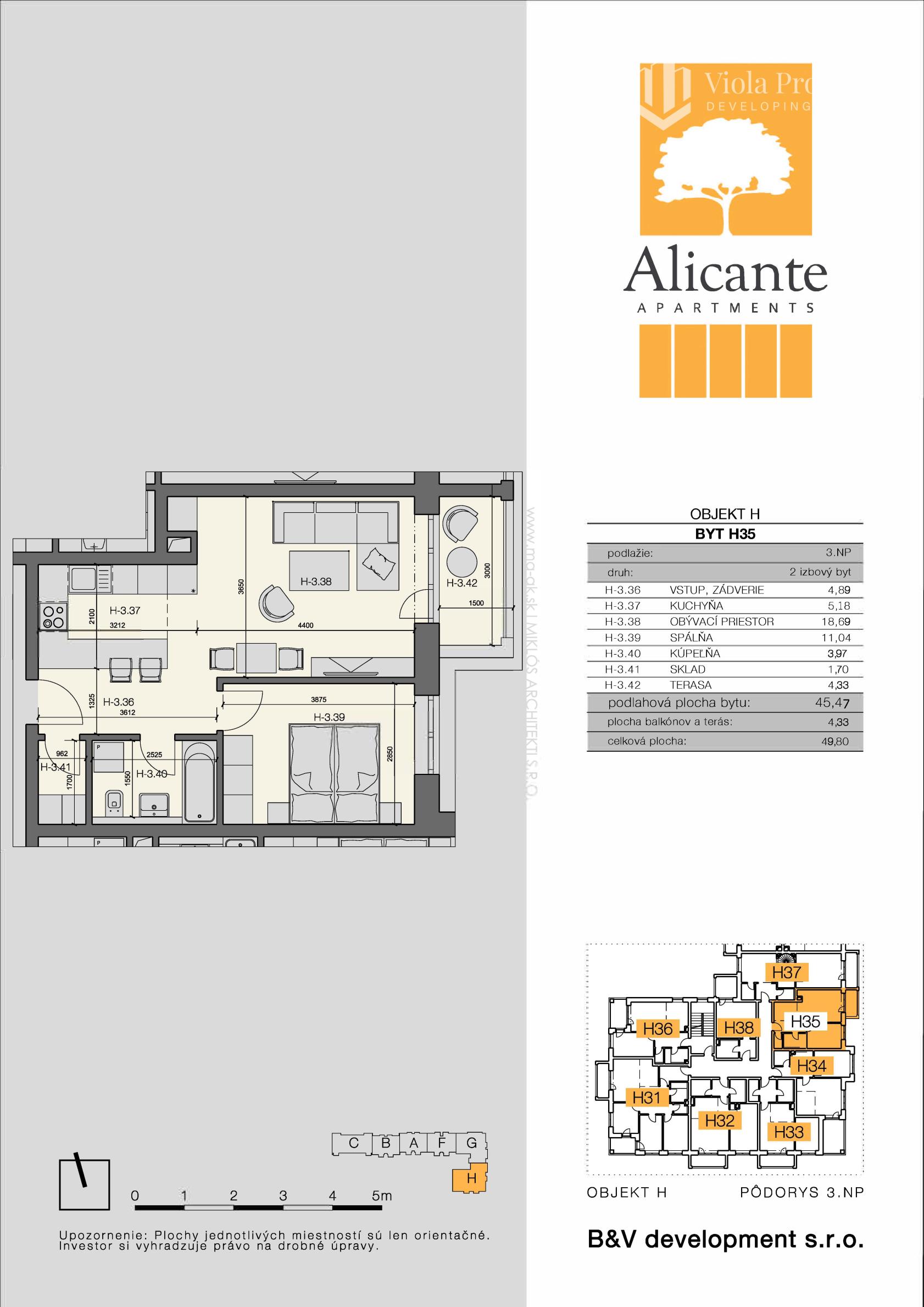 Celková plocha bytu je 49,80 m2 spolu s veľkolepou terasou o výmere 4,33 m2. Medzibytové priečky sú riešené z akustických tehál, pre čo najlepšie odhlučnenie miestností. Nachádza sa na 3. poschodí z 3 v nízkopodlažnom bytovom dome (bez výťahu). K bytu patrí uzavretý privátny areál plný zelene.